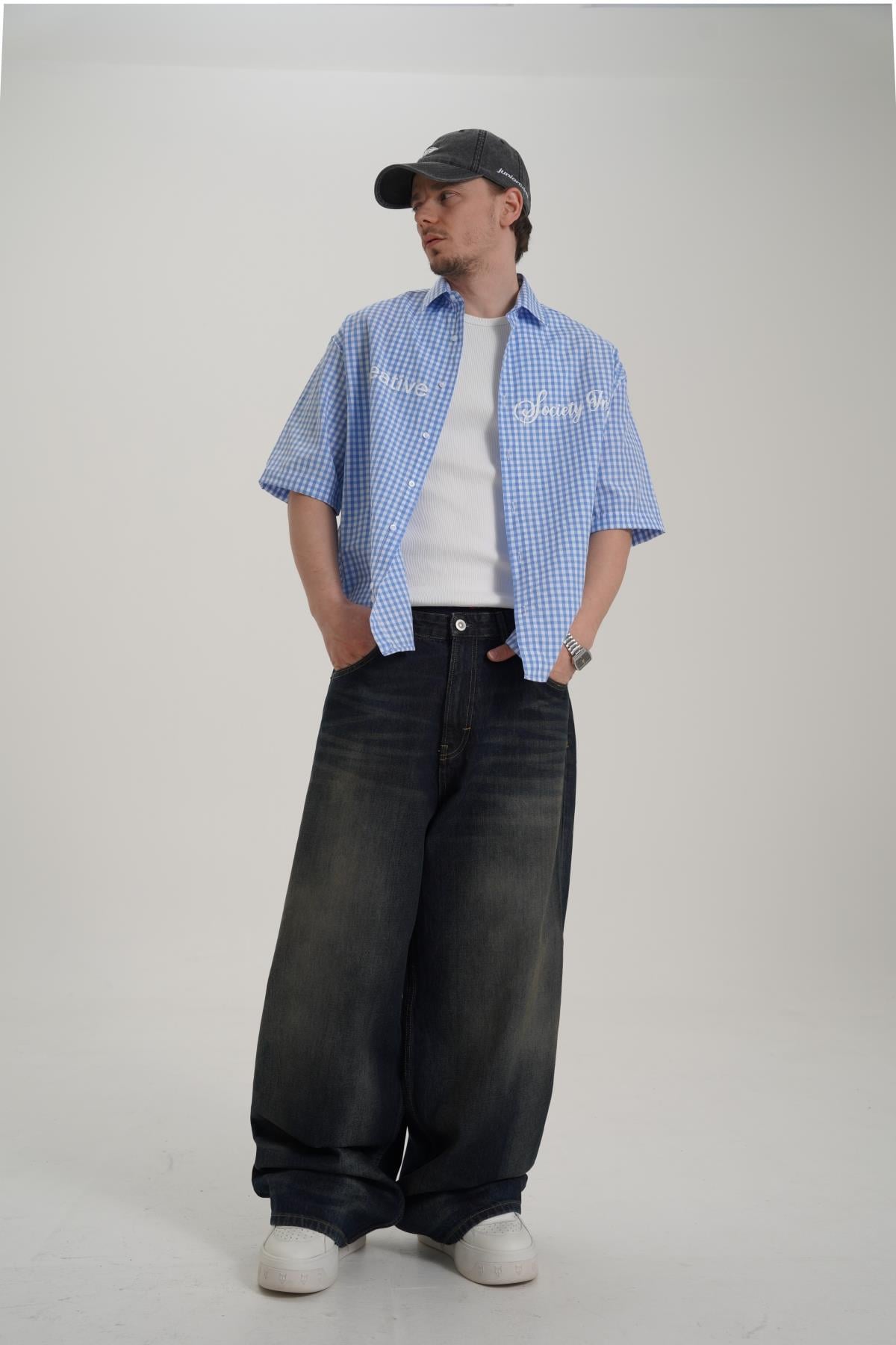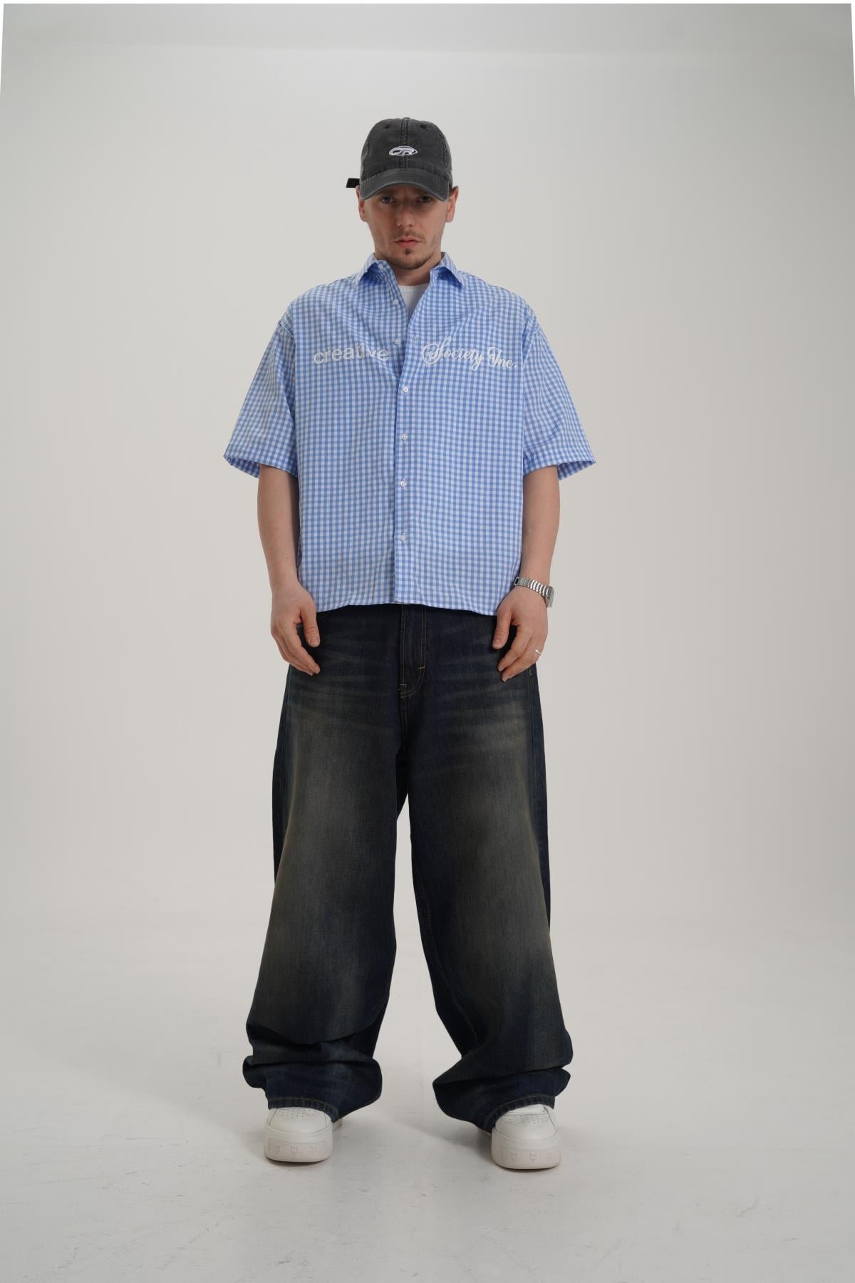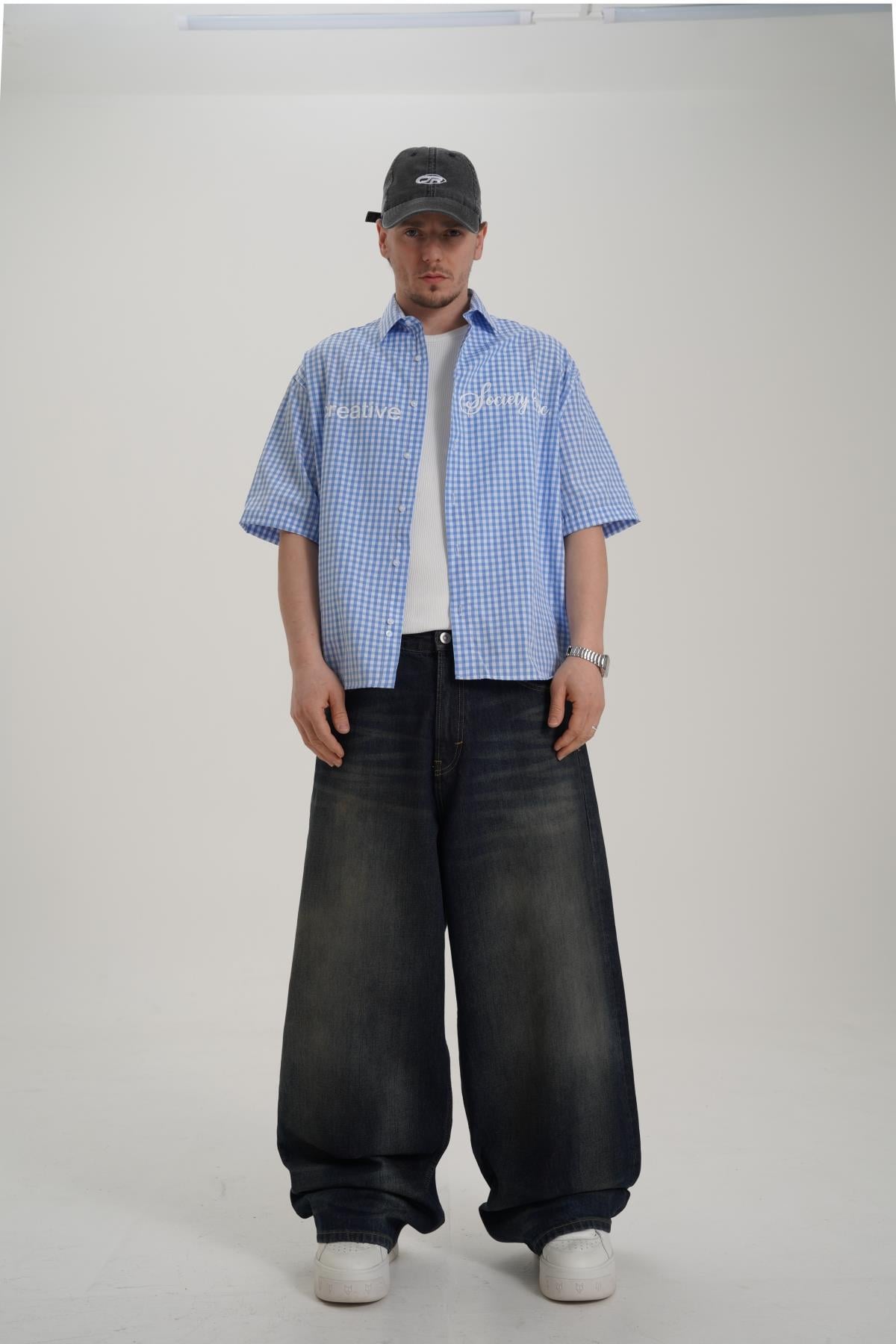 Creative Baskılı Mavi Oversize Ekose Gömlek PM01 26Y285 (P-008355)