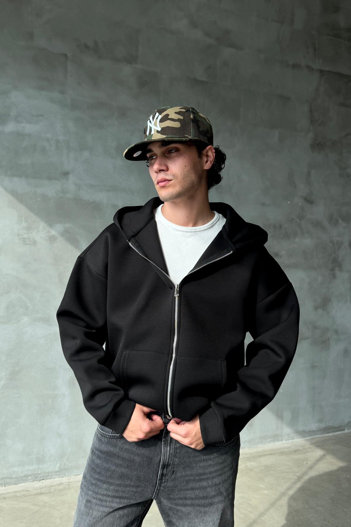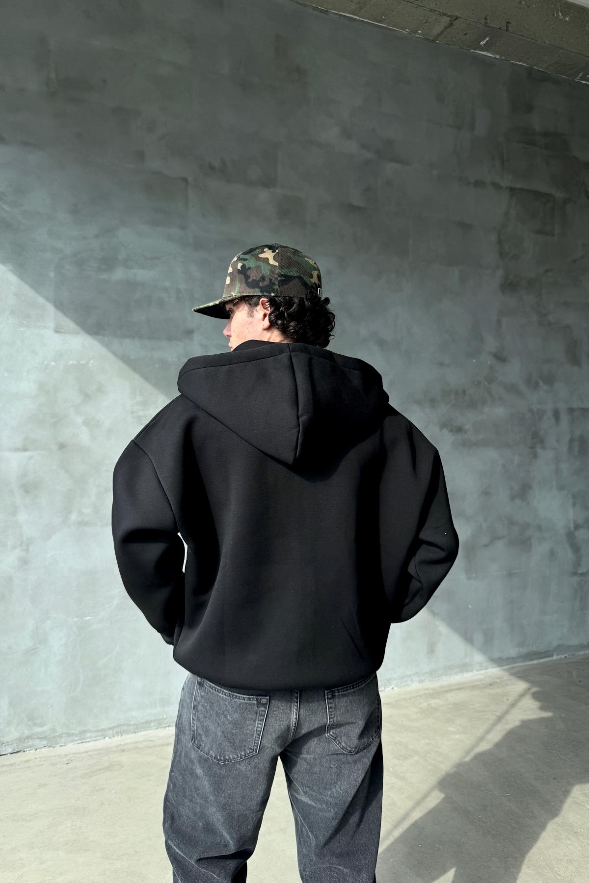 Dalgıç Kumaş Siyah Oversize Basic Zipper Sweatshirt SR01 (P-007065)