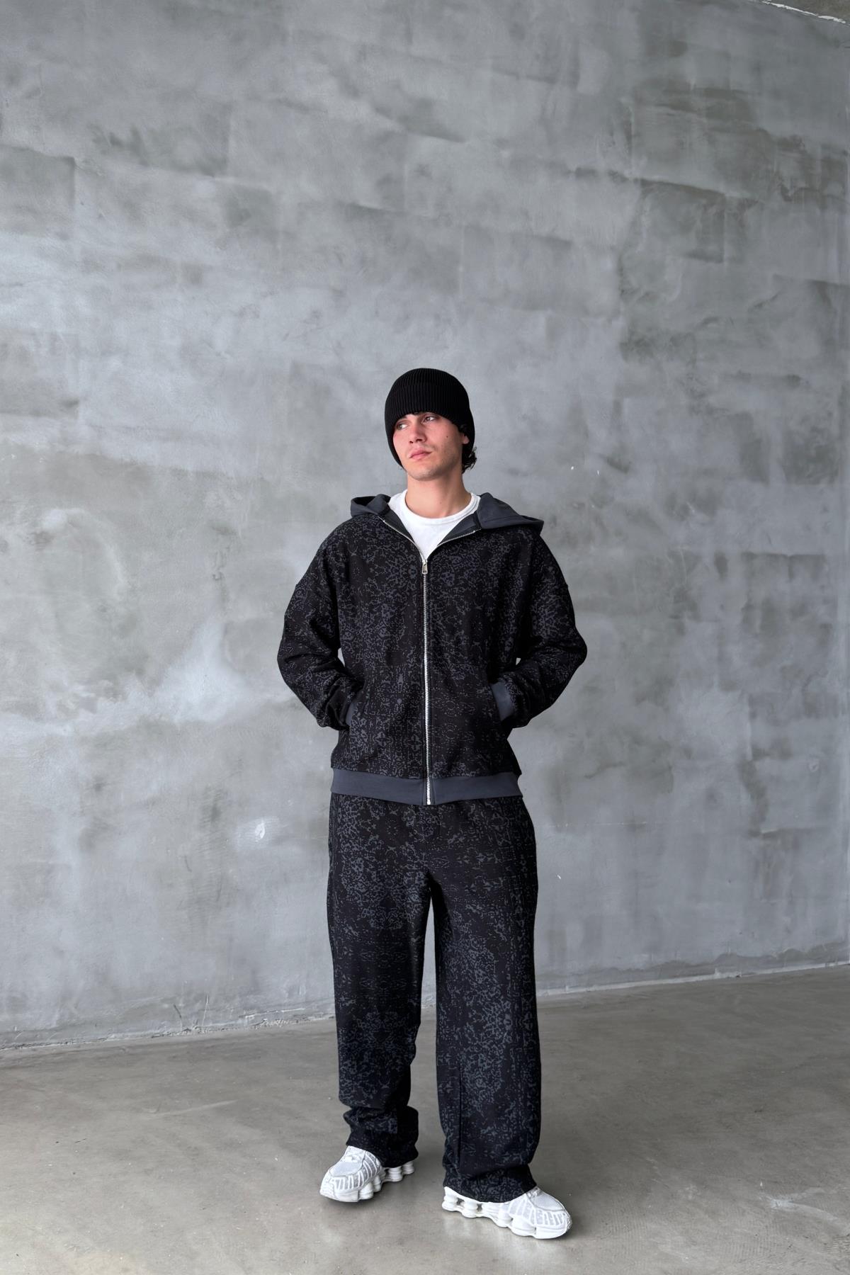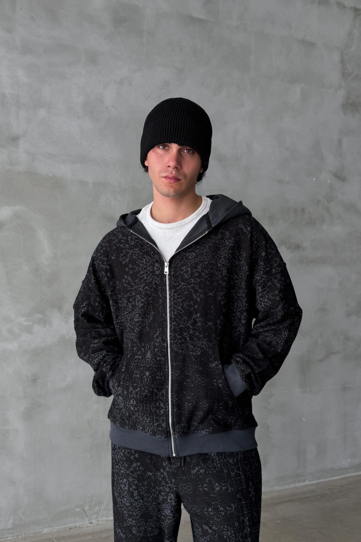 Etnik Desen Siyah Oversize Zipper Sweatshirt SR01 (P-007069)