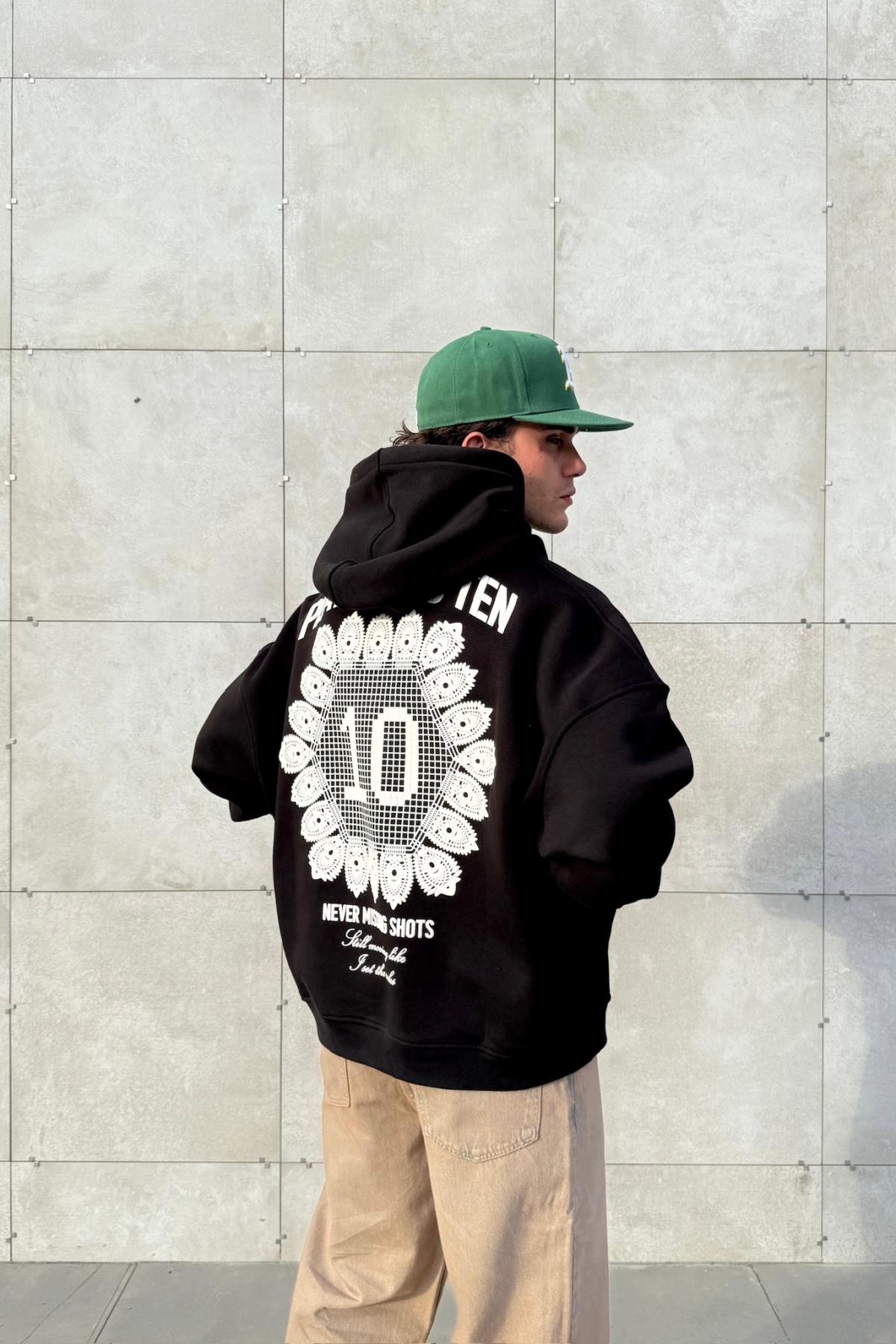 Etnik Never Mind Baskılı Siyah Oversize Hoodie JC01 (P-006982)