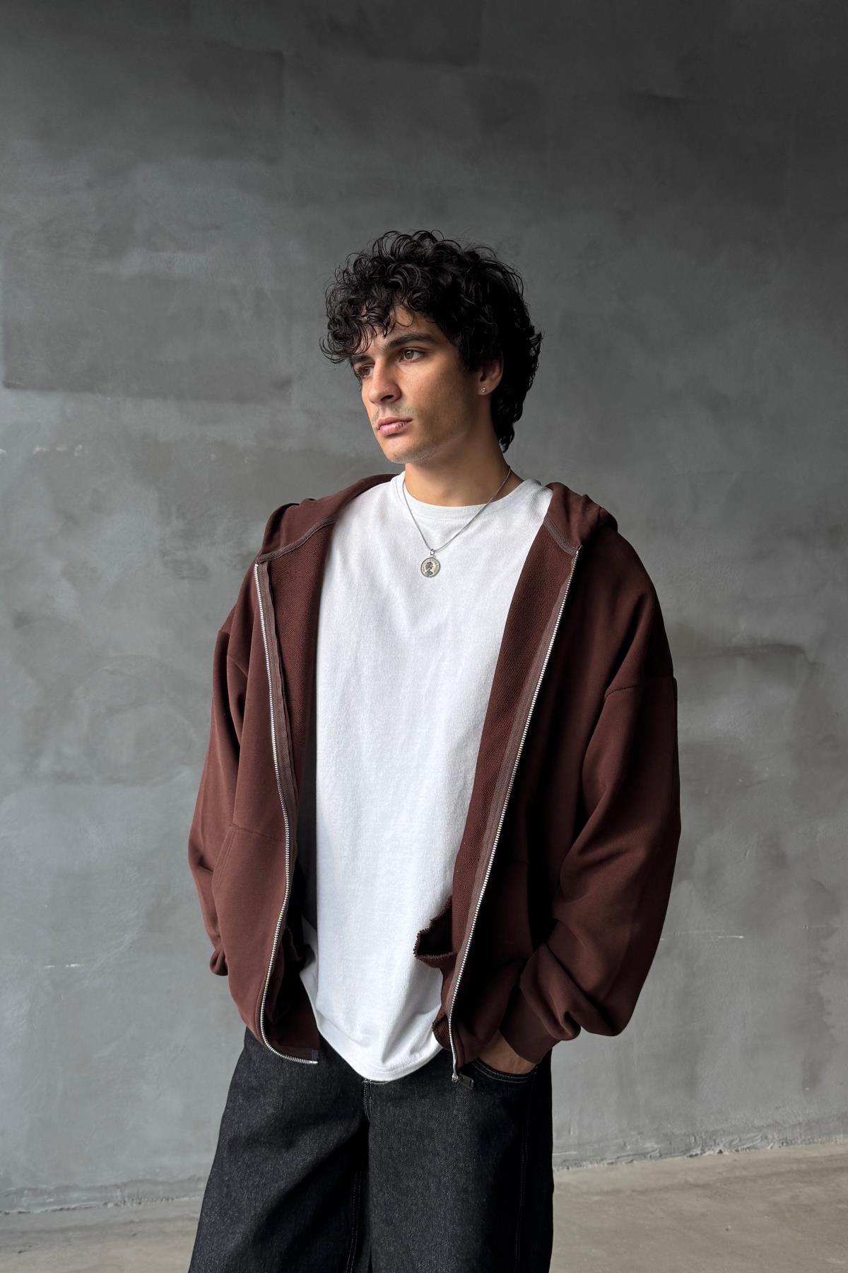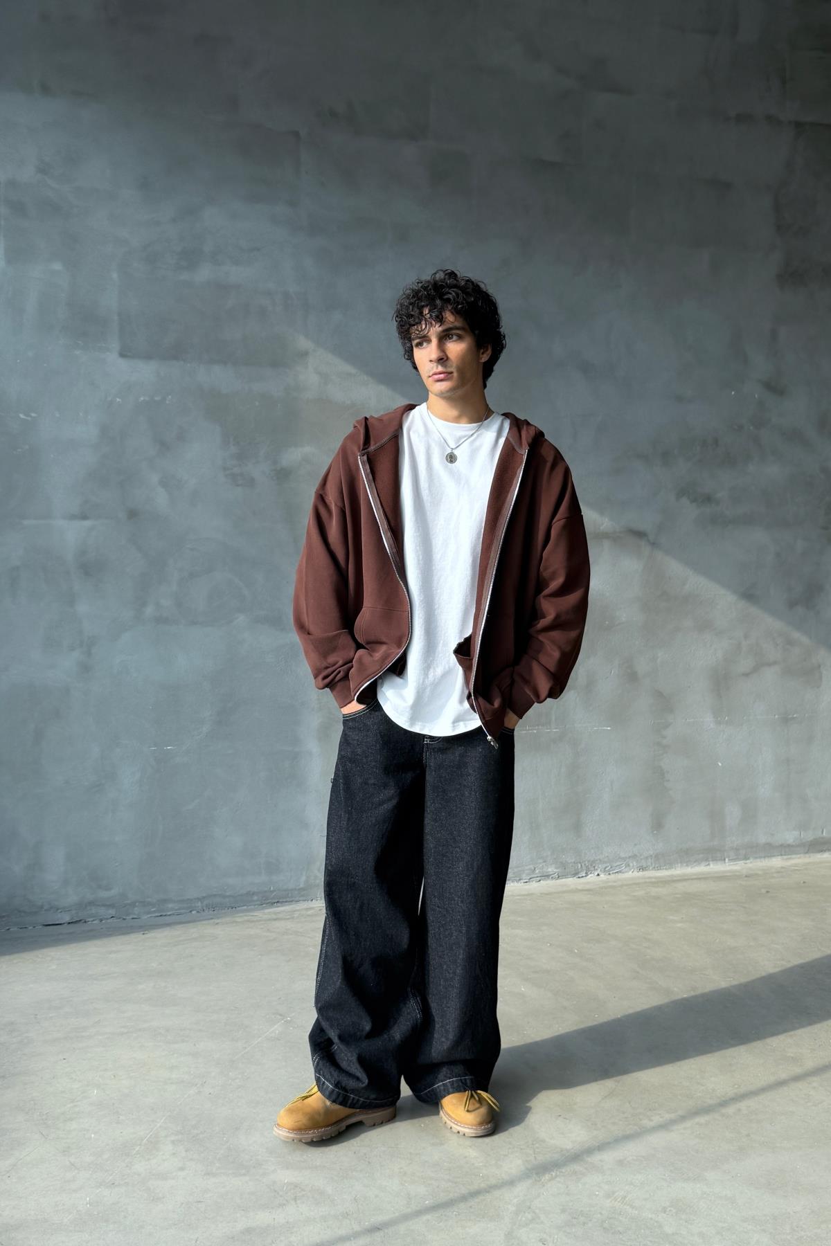 Kahverengi Yumuşak Dokulu Oversize Zipper Sweatshirt SR01 (P-007084)