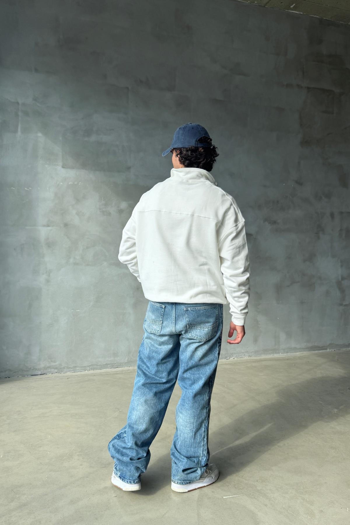 Logo Detay Fermuar Yaka Ekru Oversize Sweatshirt SR01 (P-007055)