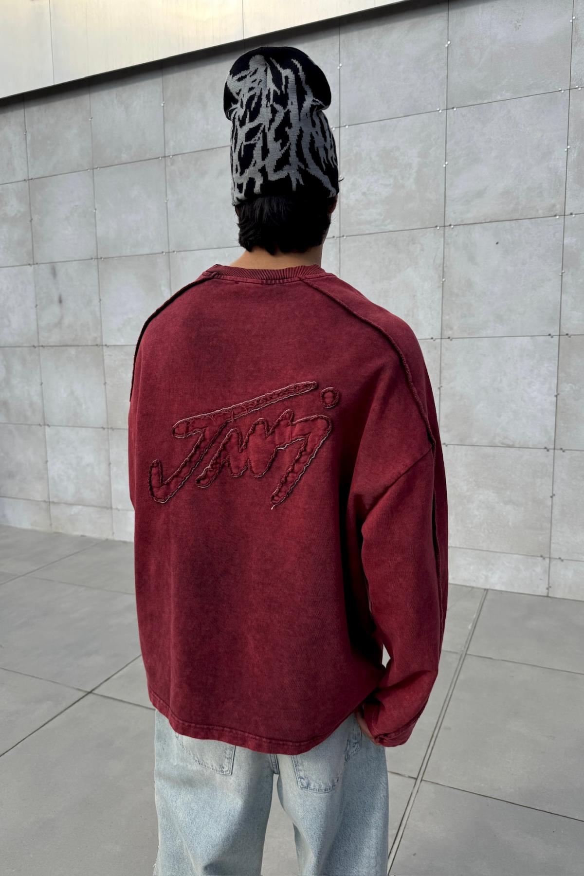 Nakışlı Acid Wash Bordo Bisiklet Yaka Oversize Sweatshirt JC01 (P-006936)