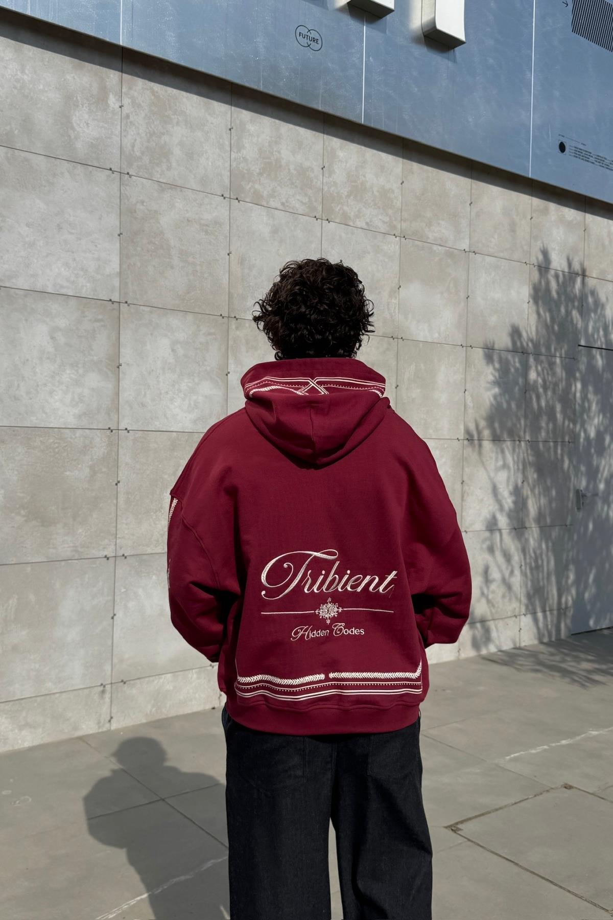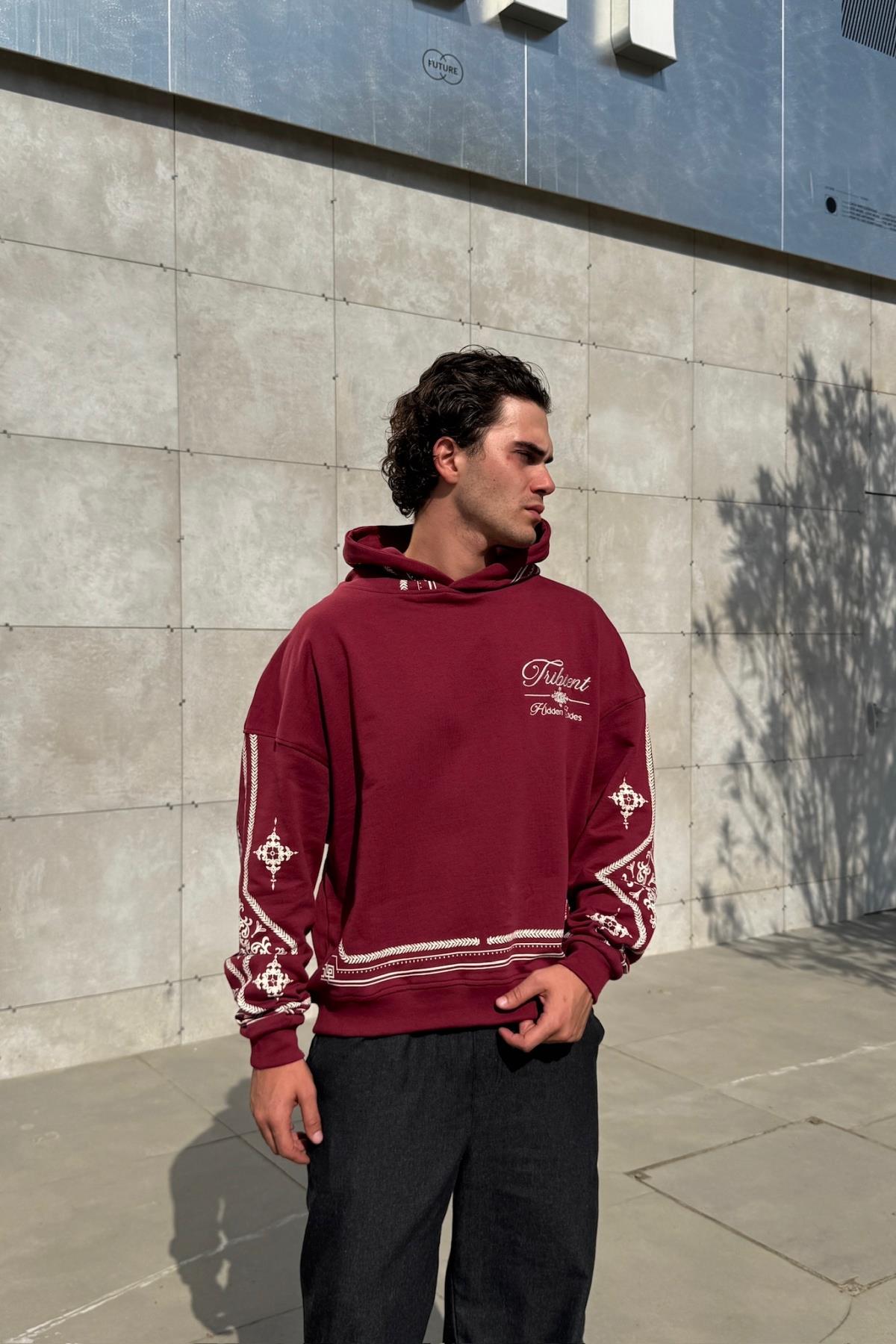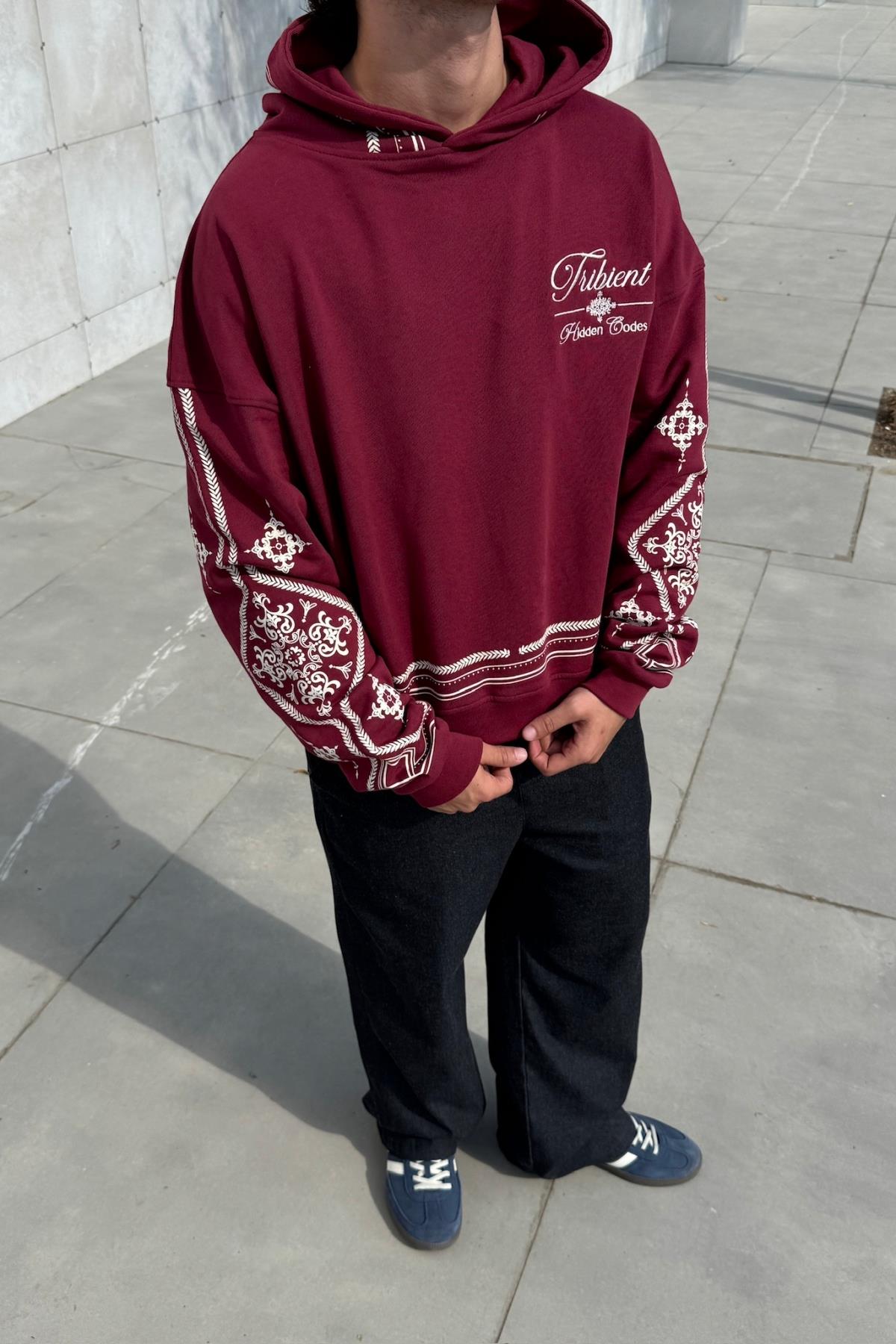 Nakışlı Etnik Desen Bordo Oversize Hoodie JC01 (P-006942)