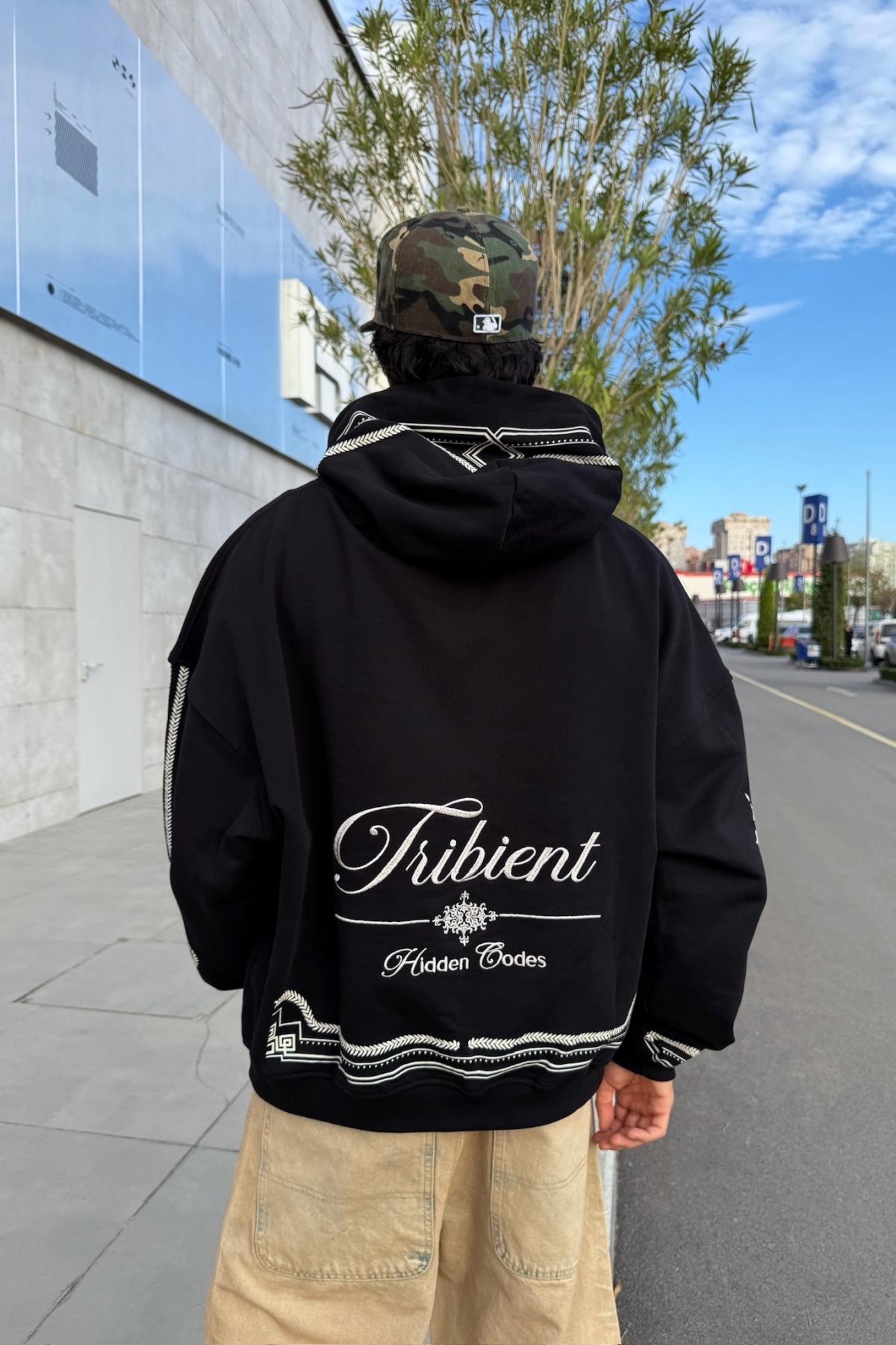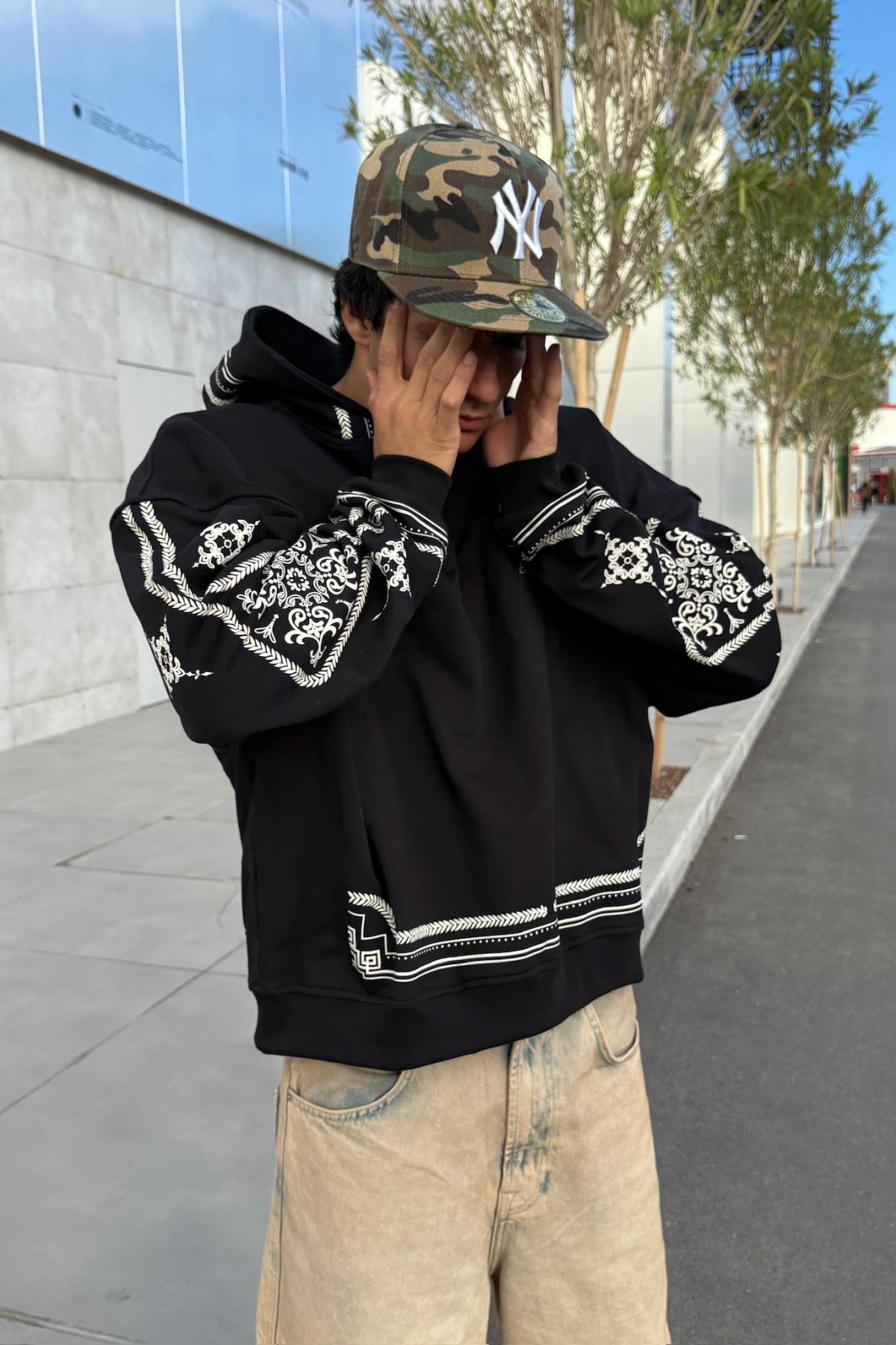 Nakışlı Etnik Desen Siyah Oversize Hoodie JC01 (P-006986)