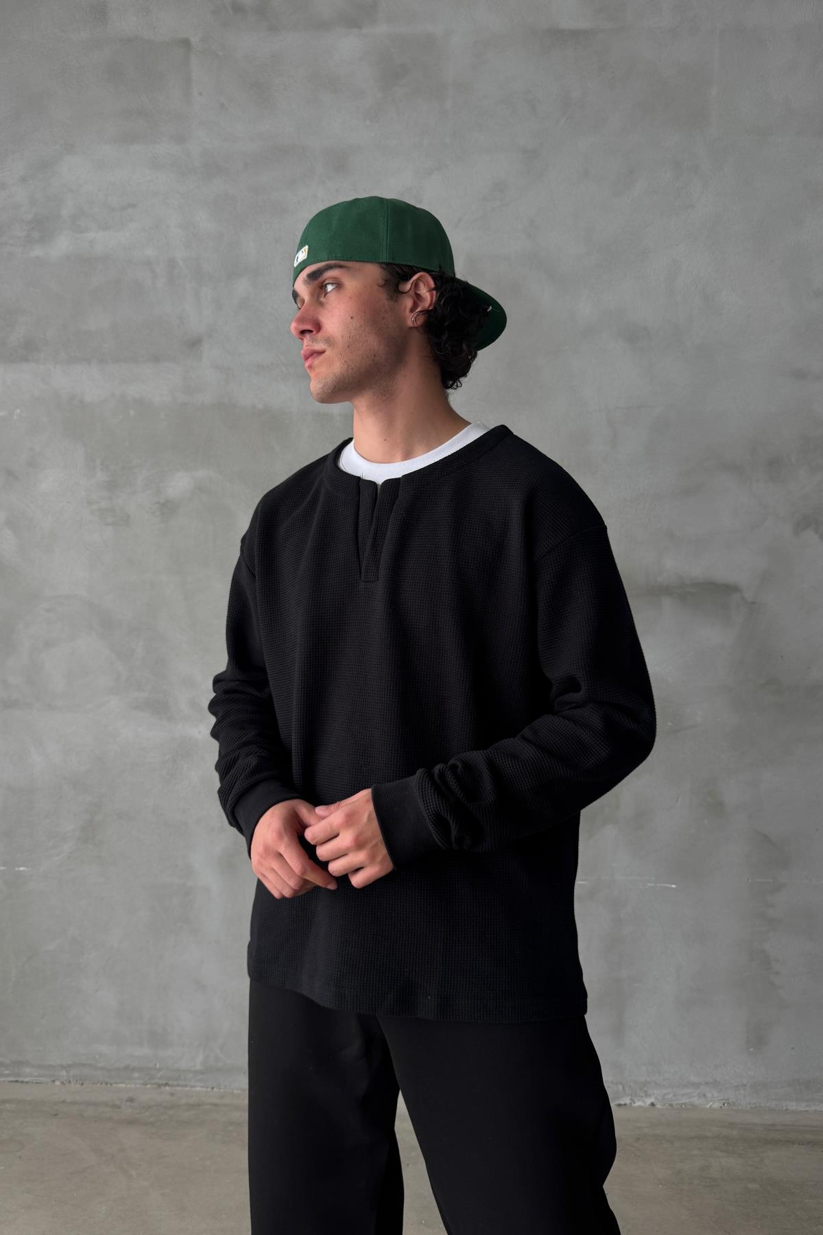 Waffle Kumaş Siyah Oversize Sweatshirt (P-007066)